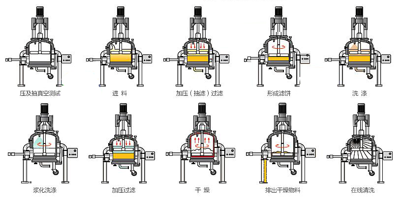 滤饼的脱水干燥处理,滤饼在被搅拌器逐层刮疏松的同时,设备侧壁、滤板的底部、以及运动的搅拌叶同时对滤饼加热,湿份迅速蒸发达到干燥的效果,通过设备内真空的方法加快蒸发速度,通过加入处理后的热氮气等介质带走蒸发的湿份,使物料加速干燥,提高干燥效果。