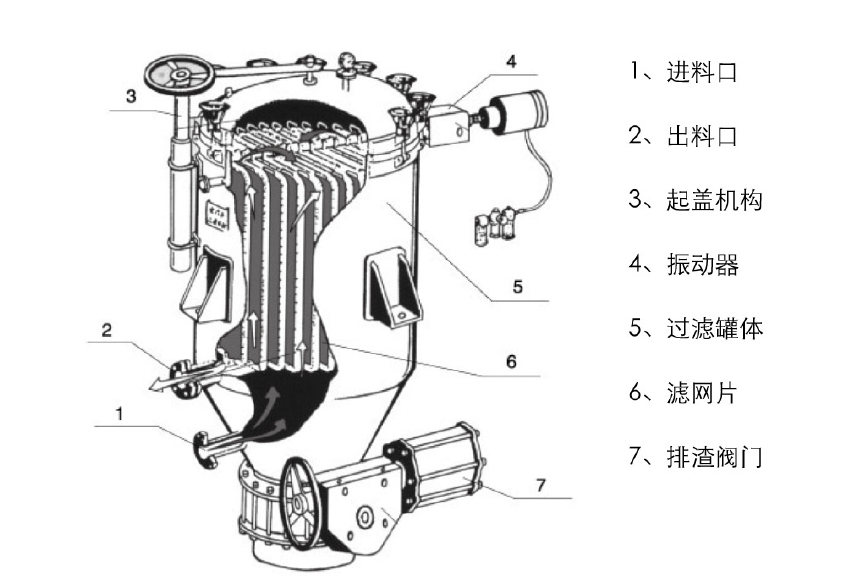 过滤机主体是由壳体、过滤板、起盖结构、自动排渣装置等组成,其中过滤板是由多层不锈钢滤材组成,安装在中心集液管上,拆装清理十分方便。