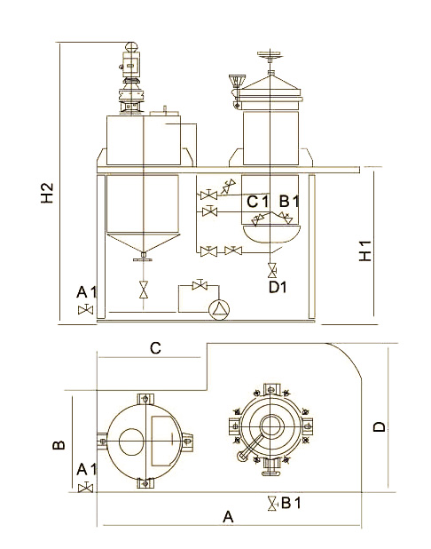 型号 | A | B | C | D | H1 | H2 | 进出口 | 进料泵 | 重量 | |